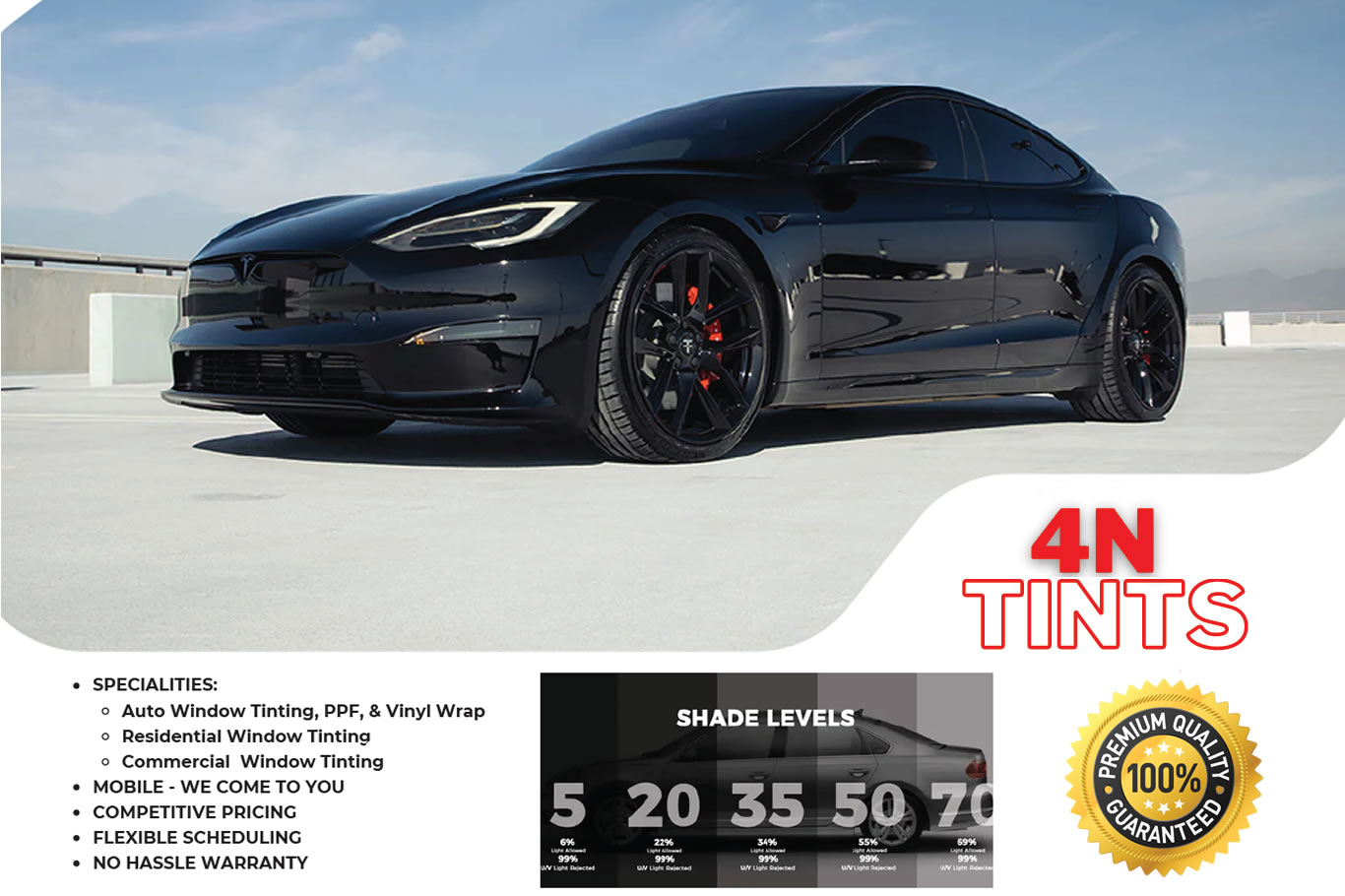 4N Tints is your premier destination for expert tinting services for vehicles, residential spaces, and commercial properties. Serving the Greater Houston, Austin and Dallas Metro areas in Texas, we are your trusted partner in bringing your tinting projects to life.With over 12 years of specialized experience in automotive window tinting, residential window tinting, and commercial window tinting, our skilled teams have the knowledge and expertise to meet your needs efficiently and effectively.We are committed to delivering the highest level of professionalism, prompt service, and top-notch workmanship. If you have tinting projects in mind for your vehicle, home, or business, contact 4N Tints today for a complimentary estimate. Let us transform your vision into a reality with our quality tinting services.